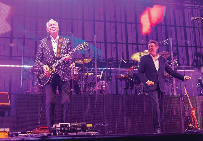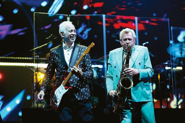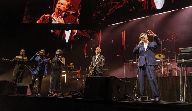 Out Of The Blue and a wellpruned The Bogus Man swiftly follow. Augmented by three backing vocalists, an additional percussionist, guitarist and three keyboard players, the sound is deep and rich with the bizarre characteristics of the songs refusing to compromise or pander. Granted, Bryan Ferry’s once-velvet croon, if not crushed, is a little frayed around the edges, but for a man of 77 years his presence and charisma is as strong as ever. Witness In Every Dream Home A Heartache, an ode to an inflatable doll against a background of material dissatisfaction that continues to unsettle and perturb. Ferry exudes a creeping mood of menace with music that shimmers and twists before exploding with Manzanera’s six-string catharsis.