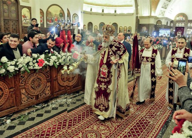 Tawadros II, the Coptic pope, holds Christmas Eve mass at the Nativity of Christ Cathedral in Cairo in 2020