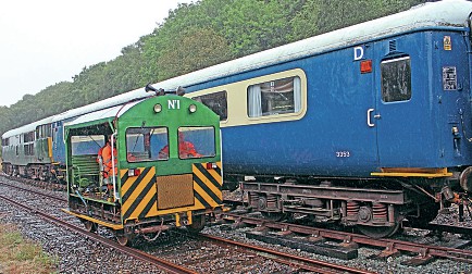 Wickham 10841 of 1975 is in operational condition on the Dartmoor Railway (DR). It is seen approaching Okehampton station from the east on August 28, 2019, carrying a permanent way gang. It was put up for sale, along with the Mk2f FO No. 3353 behind, and other items of stock. The Wickham Type 18 was refurbished by the DR track gang in winter 2014, when given the number 1. Powered by a Ford 2712E four-cylinder diesel engine, BR numbers carried were DB966033 and DX68086. On the far left is Class 31 No. 31452.