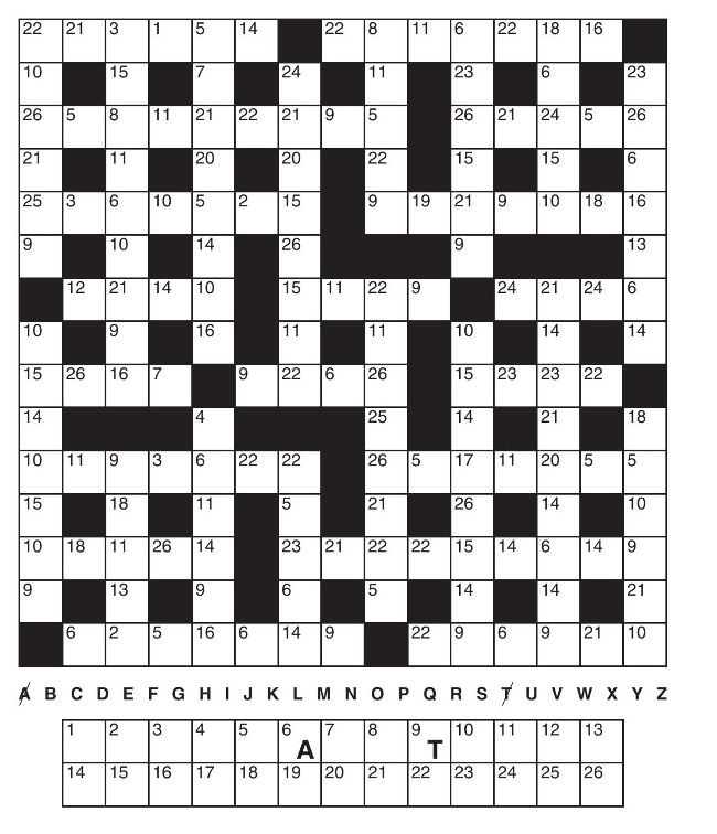 Each number in the grid represents a different letter. We’ve given you two letters to start you off, which show that 6=A and 9=T. Write these letters wherever their corresponding numbers appear in the grid and then begin to work out the identity of the other letters. All 26 letters of the alphabet will appear in the finished puzzle.
