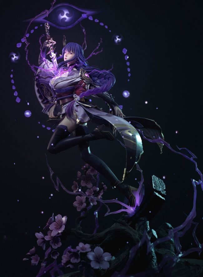 " As soon as the character Raiden Shogun was announced for Genshin Impact, I was interested in making a fan art of her. My approach for the style was semi-realistic, and I tried to make it look like a collectible statue. The most challenging part of making this piece was posing and balancing, since I didn’t really have a concept of how she’d look in the final. I wanted her pose to look dynamic. Once I was happy with the result, I exported it to Toolbag 4 for the final presentation. It was a very fun process."