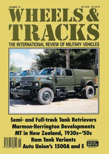 READERS' FORUM. MV EVENTS. SEEN, READ, HEARD. MARMON-HERRINGTON DEVELOPMENTS, A brief outline of the marque's post-war activities. RAM TANK VARIANTS, Command/OP, ARV, Kangaroo and other versions, reviewed by David Fletcher. SEMI- AND FULL-TRACK TANK RETRIEVERS, The Murty Brothers' US Medium Tank Recovery Truck and some British proposals. MT IN NEW ZEALAND, 1930s-'50s, A Survery of Soft-skin Military Vehicles by Jeffrey Plowman. AUTO UNION'S 1500A AND S, The trucks that never were. REMINISCENCES. SCALE MODELS. IDENTIFILE. DISCOVERIES. COLLECTIONS. BOOK REVIEWS. BEFORE AND AFTER. THEN AND NOW.