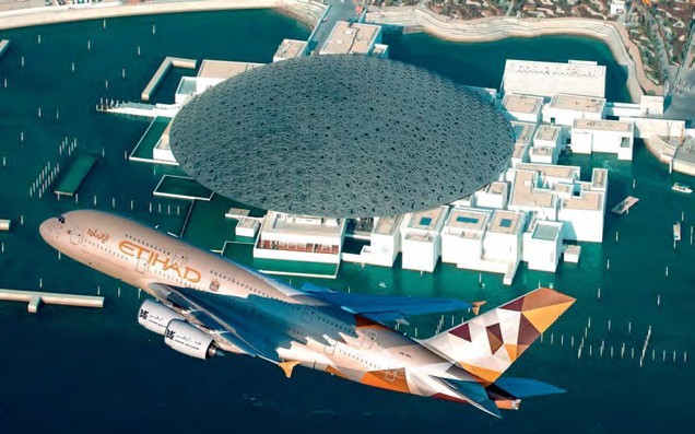 Etihad Airways has marked the opening of the Louvre Abu Dhabi with a spectacular low-level fly past by one of its Airbus A380 super jumbos. Sporting the airline’s ‘Facets of Abu Dhabi’ livery, the aircraft chosen, A6-API (c/n 233), now features Louvre Abu Dhabi’s official logo on each of its four engines to promote the gallery opening. Peter Baumgartner, Etihad Airways CEO, commented: “Echoing the sentiments from the signing of our landmark partnership agreement with Louvre Abu Dhabi last month [October 2017], we are honoured to have played our part in the inauguration of this hugely important institution.” (Photo Etihad Airways)