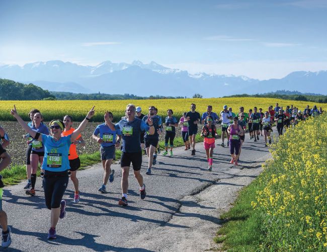 Runners pass lush and colourful fields in the Geneva countryside with a magnificent mountainous backdrop