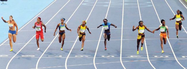Jamaica reigns: Elaine Thompson (lane four) smiles as she crosses the finish line