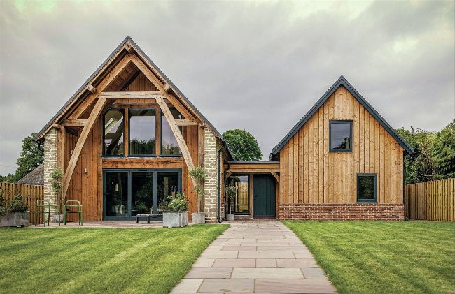 Featuring a striking sling braced oak frame by Border Oak, this bespoke forever home is wrapped in SIPs panels (see left), and clad with hit-and-miss vertical timber boards and Cotswold stone