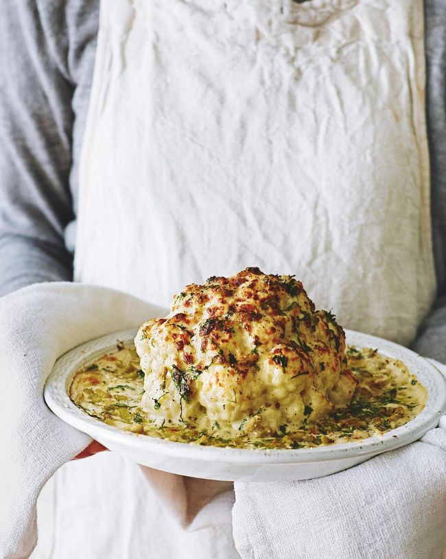 1 Heat the oven to 200°C/180°C fan/ gas 6. Bring a large pan of salted water to the boil and simmer the whole cauliflower for 15 minutes, turning halfway through. Drain, then put the cauliflower in an ovenproof serving dish and, while still hot, drizzle over the truffle oil. Set aside.