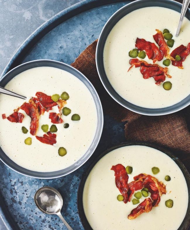 2 Tartiflette soup with ham crisps, p30