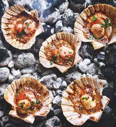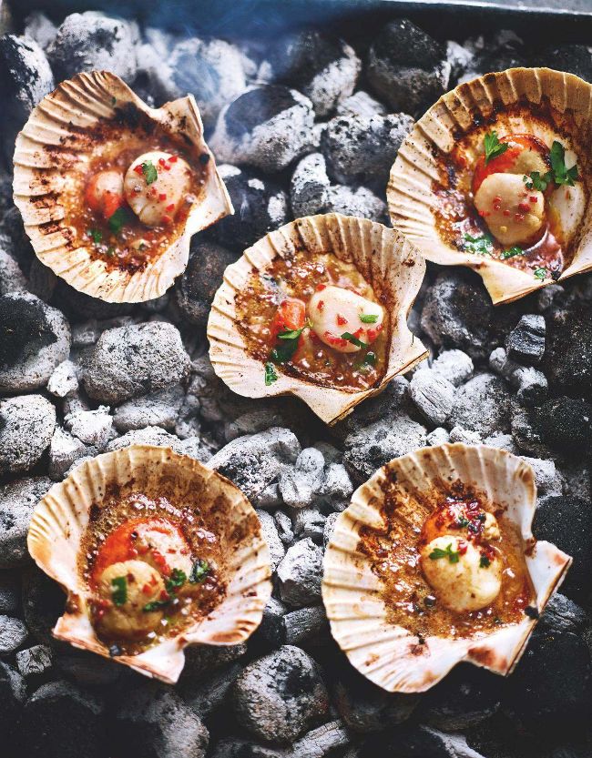 2 Light the barbecue and heat until the coals are glowing white (or heat a ridged griddle pan until just smoking). Slice the butter into 12 rounds and put one on top of each scallop with a drizzle of oil. Put the shells directly onto the coals/pan and cook for 5-8 minutes. Use tongs to turn the scallops regularly until they’re just cooked and the butter is bubbling.