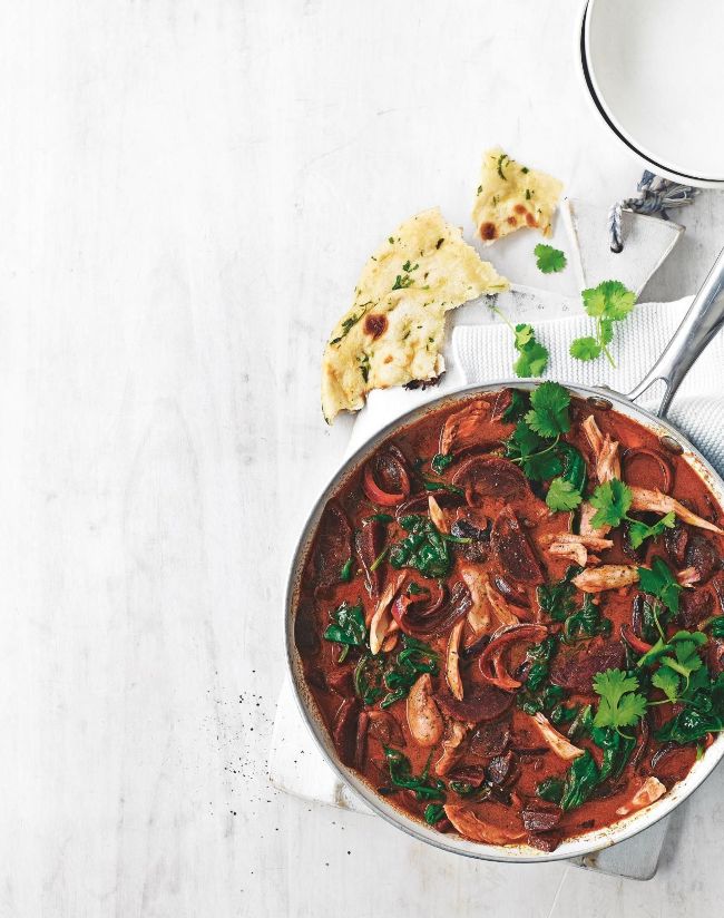 This thrifty recipe stretches two chicken legs to serve four, but with beetroot and spinach adding earthy richness it doesn’t skimp on flavour