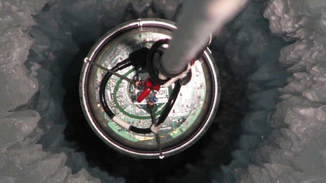 A Digital Optical Module (DOM) is lowered into the ice