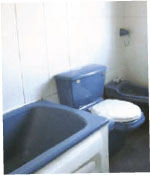 The bathroom was incredibly dated, with an ugly, dark blue suite, old-fashioned tiling and a cramped, tatty shower cubicle. The floor was covered in horrible worn carpet, and the woodchip wallpaper was damp and mouldy. It wasn’t pleasant!