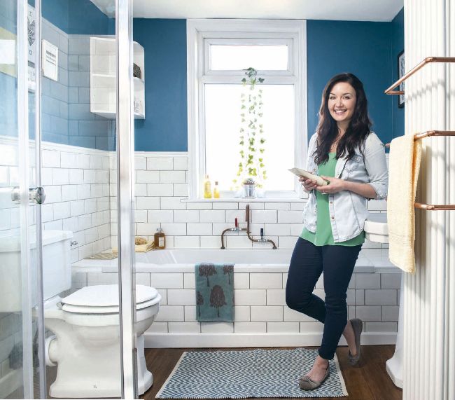 Martha was keen to use vibrant colour and she wanted the bathroom to feel clean and fresh. The gorgeous teal tone she chose makes a bold statement and a brilliant backdrop for the white suite and smart, brick-effect tiling