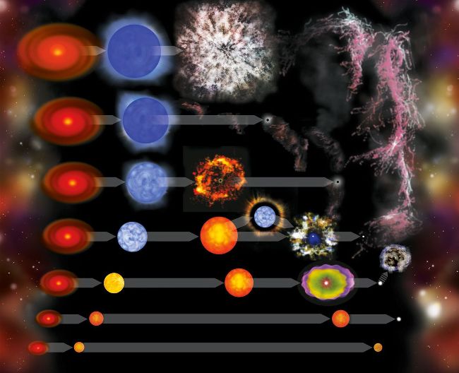 All stars go through life cycles, changing their appearance and behaviour on a timescale much too slow for us to observe directly. Most of the stars we see are in the ‘main sequence’ phase of their evolution, in which they convert hydrogen into helium through nuclear fusion. The amount of time they spend in this phase – and what happens afterwards – depends on the star’s mass. The highest mass stars, greater than three times the Sun’s mass, appear blue in colour when they’re on the main sequence. They get through all their hydrogen fuel more quickly than lower mass stars.