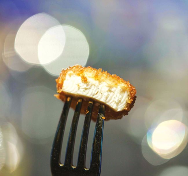 A nugget made from lab-grown chicken meat, made in Singapore in 2020