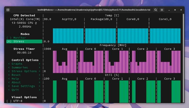 Linux doesn’t have many stress-testing tools, but it isn’t surprising that one of the ones it does have works on the CLI. The Stress-Terminal UI, or S-tui, can maximise your hardware as per your whims, and also doubles up as a nice CLIbased system monitor.