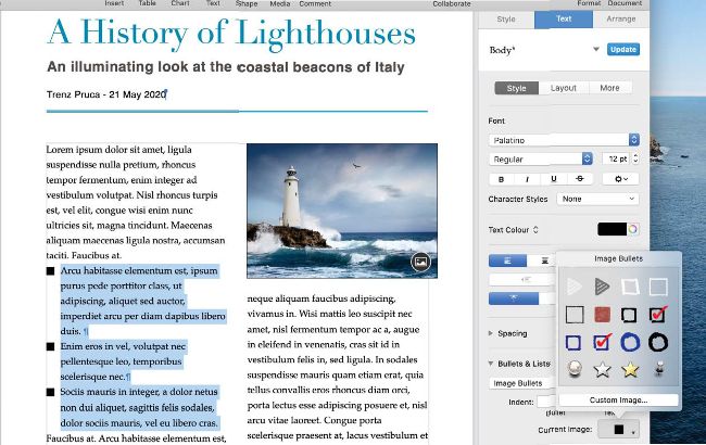 Select the text of your first list item. In the Format inspector’s Style tab, pick Bullet from the Bullets & Lists pop-up. Click the triangle to the left and pick Image Bullets from the pop-up just below. In the Current Image item choose a predefined option, or click Custom Image to provide your own.