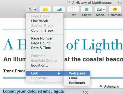 You can link text to a web page, an email address, or a bookmark within the same Pages document.