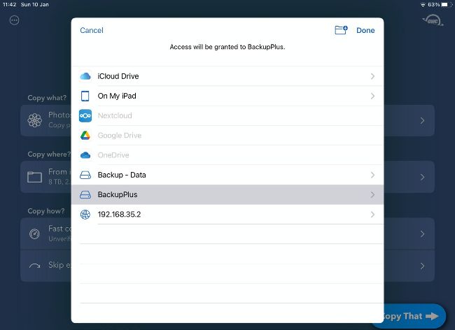 Copy That is designed to quickly copy content from your Photo Library to an external drive via a suitable Lightning adapter. By suitable, we mean a USB external drive with its own power source, or a flash drive with minimal power requirements. For our review, we successfully used the app with a cheap Lightning adapter that supports SD and microSD cards as well as USB drives.