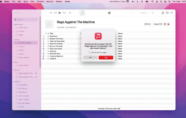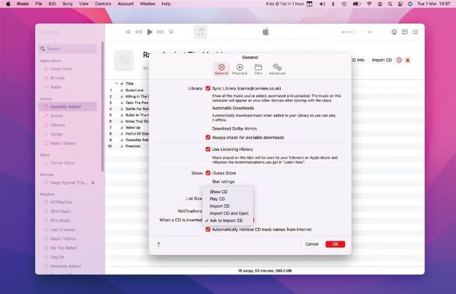 Before you start to import, it’s worth taking a trip into the Music app’s settings (in Music > Preferences). If you have an internal CD/DVD drive or have connected an external one you should see an option in the General tab for “When a CD is inserted”. You can choose between Show CD, which displays the disc in Music but doesn’t play it; Play CD, which does what you’d expect; Import CD, which automatically copies the whole CD to your Library; and Import CD and Eject.