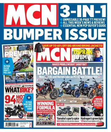 Get ready for a showdown as the new GSX-8S and Hornet take on the MT-07 and Trident 660 in a naked middleweight shootout. Plus, Toprak Razgatlioglu ditches Yamaha for BMW in 2024, and big-brand biking jackets are on sale for up to 46% off. Don't miss out on the 36-page Isle of Man TT preview and essential new PCP buyers guide. All this and more in this week's MCN.