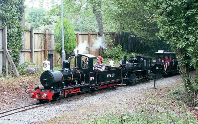 Many trains were double or triple headed at the Trago Mills steam gala. Destined for use at the Astbury Light Railway once approval for operations has been granted, No. 4 Norfolk Pioneer works with BSR resident 2-6-2 No. 24 (Coleby Simkins & Vere 1991). No. 4 was built by Tony Martin of the Wells & Walsingham Light Railway, Norfolk in 2011, but never part of the official fleet. Therefore, ‘WWLR’ could not be used so it became ‘WWER’ = ‘Wibbly Wobbly Engineers Railway’ after the builder’s former motorcycle racing team! It is hoped Trago Mills will hold another steam gala next April.