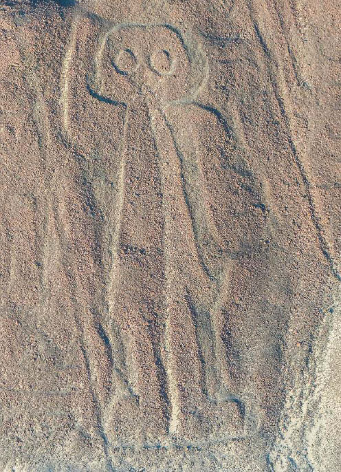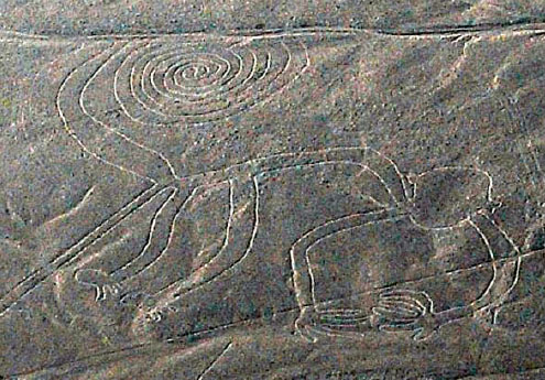 Two famous Nazca Geoglyphs: (Top) The Monkey located at 14 42’24.93 S 75 8’18.40 W. (Bottom) The Owl-Man, also known as the Astronaut, Spaceman, or Priest is located on a hill at 14 44’42.71 S 75 4’47.24 W.