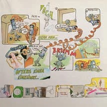 EKraftwerk’s early ambitions. Its opening panel envisagesapastel-paintedsunriseoverDüsseldorf, with a giant TV transmitter in the Rhine and monster walkie-talkies and headphones floating in the sky. Later, a globe turns with only Düsseldorf marked and the words “Kling-Klang” circling, as if the world belongs to these unknown young Germans and their music. “It wasn’t an ambition, like ‘I wanna set a footprint on the world from Düsseldorf’,” Schult explains. “It was more with a twinkle in the eyes. I shared with Ralf and Florian a certain humour and a romantic feeling towards technology.”