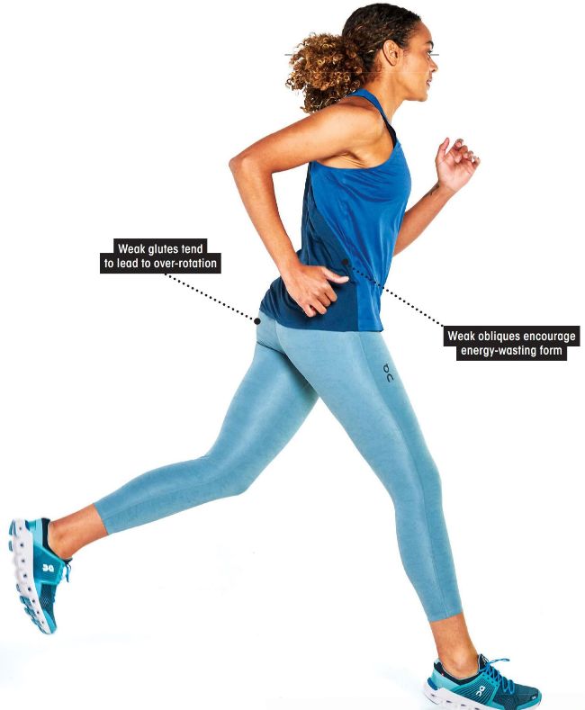 To run faster our body has to propel you forwards. This movement is generated by the movement of your hips and your spine. It’s the rotation in your spine which causes your hips to twist, which generates the power to drive you forward. The more efficient the spine-hip rotation is, the faster you will be able to run. Often runners start to over rotate, which reduces the amount of forward motion, as too much energy is lost in a sideways movement rather than a forward movement. This leads to instability and a risk of losing your balance or tripping over your own feet.