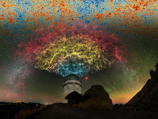 What you’re looking at here is a map. Not of Earth, the Solar System, or even the Milky Way, but of the Universe on the most astronomical of scales. This sprawling multi-coloured web contains some 600,000 galaxies and is superimposed onto an image of NOIRLab’s Nicholas U. Mayall 4-meter Telescope, which was used to capture the data. The map was put together as part of the Dark Energy Spectroscopic Instrument (DESI) survey, a five-year mission to create the largest 3D map of the Universe. So vast is this data set, and by extension, our Universe, that all the galaxies here represent less than 0.1 per cent of the full survey volume. Feeling insignificant yet?