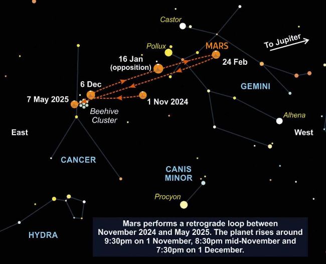 After a fairly poor showing of planets early in 2024, fortunes reverse as we enter the latter part of the year. Jupiter is now dominant in the night sky, a bright object nestled against the stars of Taurus, the Bull, near the Pleiades and Hyades open clusters. Mars follows on later in the night, its salmon-pink colour a useful way to confirm its identity. Also referred to as the Red Planet due to this colour (something that arises from the fact that Mars is essentially rusty, its surface containing a lot of iron oxide), Mars’s orbital period means it’s well-presented for telescope viewing approximately every 2.1 years.