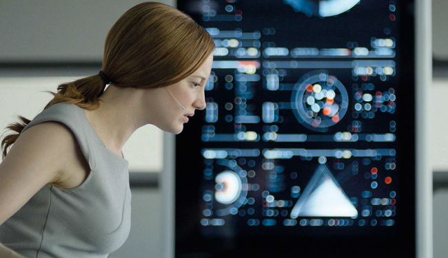 Andrea Riseborough as Victoria in Oblivion (2013), with a wall panel data display designed by Bradley G Munkowitz (GMUNK)