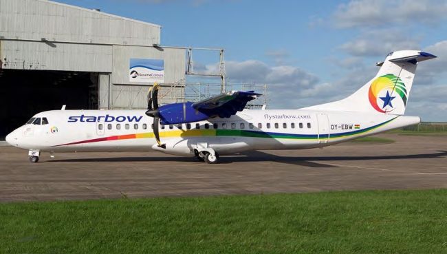 Nordic Aviation Capital ATR 72-500 OY-EBW (c/n 743) was rolled out of the Airbourne Colours paint shop at East Midlands on October 29 in the livery of Starbow Airlines. The turboprop is due to be re-registered 9G-SBF once it has been delivered to the Ghanaian carrier. AVIATION IMAGE NETWORK/BRAVONOVEMBER