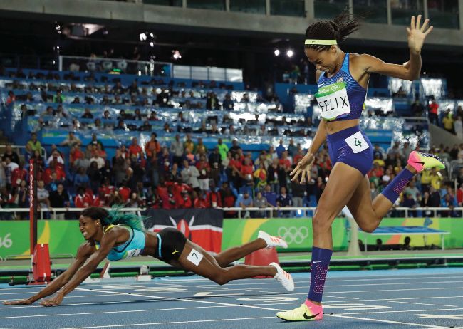 Rarely has the will to win been more dramatically illustrated than when Shaunae Miller dived for the line to beat Allyson Felix and controversially take the 400m gold (left). Rarely has the Olympic spirit been better demonstrated than when Nikki Hamblin stopped to assist the stricken Abbey D’Agostino in the 5000m (below). D’Agostino had helped Britishborn Hamblin up after a fall which tripped them both earlier in the race. Finally, Jessica Ennis-Hill (above) gets in the zone during the heptathlon shot put