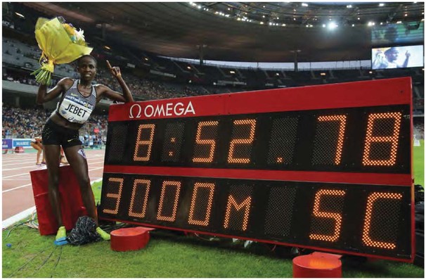 On a hot evening which reached 33°C at the Stade de France, the Kenyan-born 19-year-old, who represents Bahrain, took more than six seconds off the world record which had been set by Russia’s Gulnara Galkina in 2008 and finished more than nine seconds clear ahead of Kenya’s world champion Hyvin Jepkemoi, who had claimed silver behind Jebet in Rio.