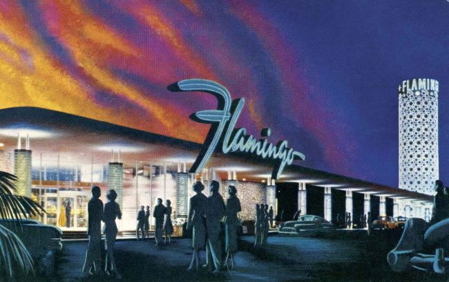 A DREAMY DEPICTION OF THE 1953 FLAMINGO HOTEL AND CASINO ILLUMINATED AT SUNSET.