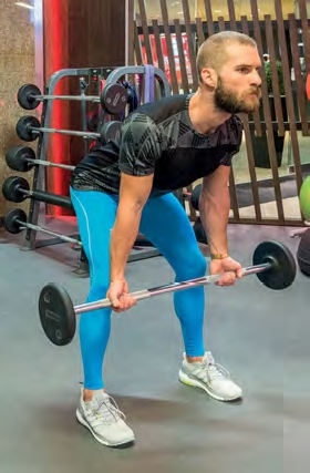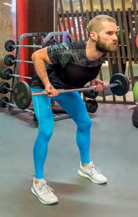 ►HOLD the bar in your hands with your palms facing out. Keeping your core engaged and your back tight and flat, bend forward from your hips to about a 45º angle.