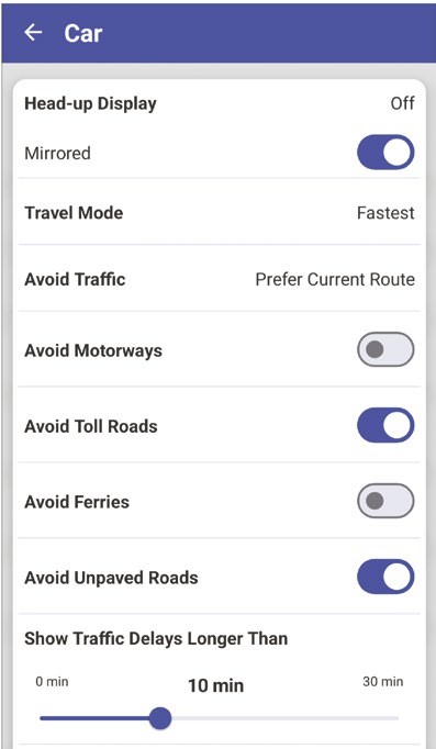 To access the setting, tap the top-left cog icon then Navigation. Now tap Car near the bottom and move the slider below ‘Show Traffic Delays Longer Than’ ( 1 in our screenshot). Another useful option lets you avoid toll roads 2 , which I’ll certainly turn on next time I drive through France.
