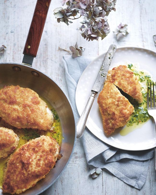 1 Cut a pocket inside the chicken breasts by piercing the thick end with a thin, sharp knife. Push the blade of the knife down to near the thin end of the breast, being careful not to cut right through the flesh. Sweep the blade from side to side to make the pocket wider on the inside while keeping the opening incision small. This will help stop the lovely garlic butter leaking out. Set aside.