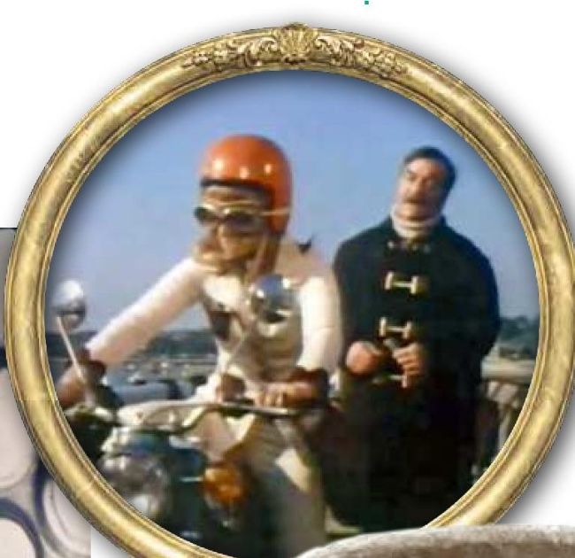 Jo borrows a motorbike from Robbins (Royston Tickner) in Episode One of The Sea Devils (1972).
