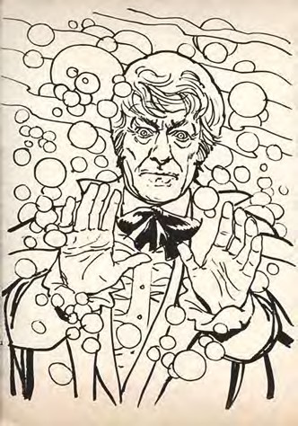 For 1973, however, the company returned to a form that had worked well for them in 1966 – aDoctor Who colouring book. The cover featured a photograph of the Third Doctor from The Time Monster and the book comprised 64 pages of blackand-white line drawings for colouring, and all this for just ten pence. The drawings included the Third Doctor, his assistant (a rather disquieting mash-up of Liz Shaw and Jo Grant), and the