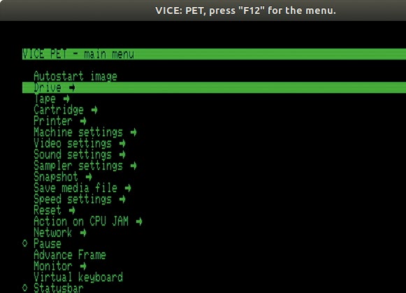 VICE’s main menu is full of useful stuff, such as Drive. Here we can insert virtual disk images and create new disks to save our work.