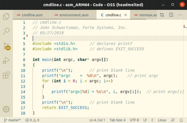 Our next programs are cmdline.c and cmdline.asm (see screenshots below and on page 88). When a main function is invoked it can include arguments that the user types on the command line. If you type ./cmdline alpha beta goldfish at the command prompt, Linux will execute the program cmdline. The program will receive as parameters, argc, which is the total number of string arguments (four in this case) followed by an array of pointers to the strings on the command line that are in an array of arrays called argv[]. In this case, cmdline will receive as strings ./cmdline , alpha , beta and goldfish . Cmdline.c and cmdline.asm read and print argc and argv[]. Since this is Linux, you can guess how we receive these parameters. W0 will have the integer argc (the first argument), and X1 will have the vector of pointers, **argv. cmdline.c should be easy to understand. The prototype for main is int main(int argc, char* argv[]) .