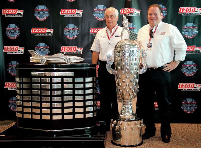 Rivals Roger Penske and Chip Ganassi in 2010 with the Harley J Earl Trophy, left, presented to the winner of the Daytona 500, and the Borg-Warner Trophy – for the winner of the Indy 500