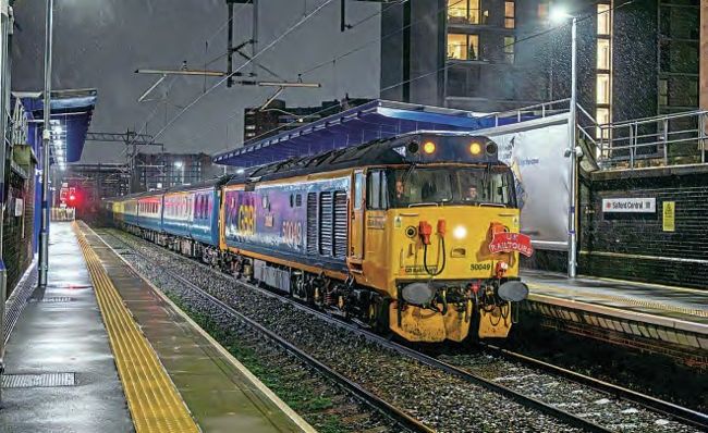 Class 50 No. 50049 Defiance passes through Salford Crescent station with UK Railtours return Christmas special from London Euston to Preston via Manchester Victoria on December 9. The train was in top-and-tail mode with No. 50007.