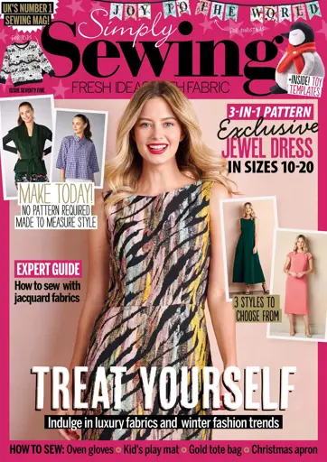 This issue comes with a little bit of sparkle! We can’t wait to get started on making The Jewel Dress – we’re not quite sure when we’ll get to wear it, but shopping for luxurious fabric for a special occasion is almost as exciting as the event itself! Speaking of sparkle, we are loving the luxe tote in this issue which puts all our other canvas bags to shame! We have some really playful makes for little ones too this month, including the cosy Kid’s Sweatshirt, an adorable plushie penguin toy, and an adventure play mat. And of course you’ll find lots of festive sewing projects in here too! ‘Tis the season after all...