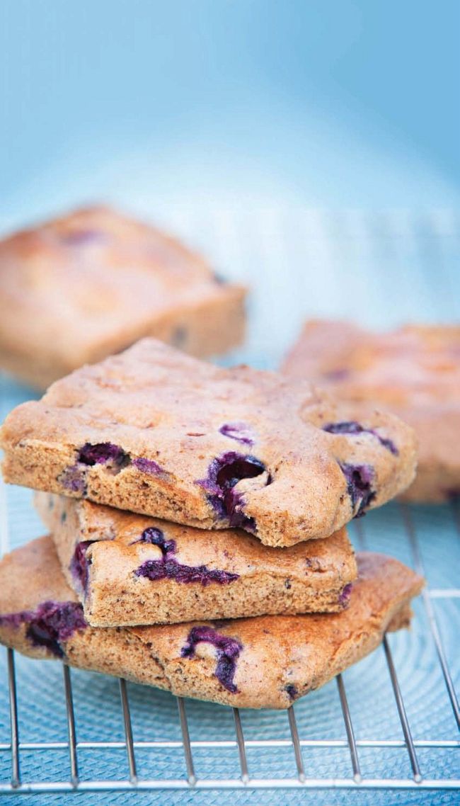 3 Put all the dry ingredients into a large bowl and mix together. Add the flax seeds and water mixture, then the wet ingredients, apart from the blueberries, and whisk together until you get a smooth batter. Fold in the blueberries and pour the mixture into the baking tray.