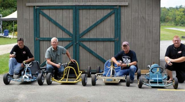 THE 2018 BIGGIE WINNERS, L TO R, TED TINE 1967 MARGAY NEW BREED/MC91B1, BOB WATKINS 1960 YELLOW JACKET /WEST BEND 580, JOHN MCCORVEY 1959 DAVID BRADLEY RACER/CLINTON A500 AND KYLE MOODY 1961 EVANS FLYWEIGHT/ MCCULLOCH MC20.