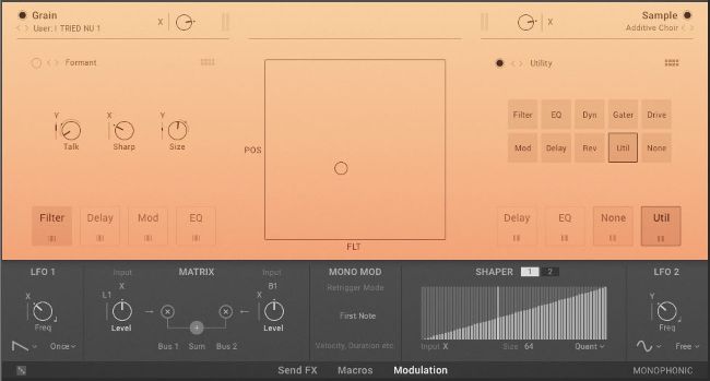 The granular engine uses audio content optimised for the scanning, looping and shifting that takes place here, with its output running from swarms of glitched atonal madness, to beautiful drone clouds. Although most granular synthesis systems can be unpredictable, the flip side is their ability to help create interesting and inspirational new sonic ideas.