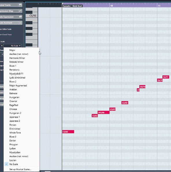 1The Scale Assistant in the Key Editor Inspector is great for matching new or previously-recorded note events to a musical scale. The scale is chosen in the editor or takes its queue from the Chord Track (blanked if the Chord Track is unused).
